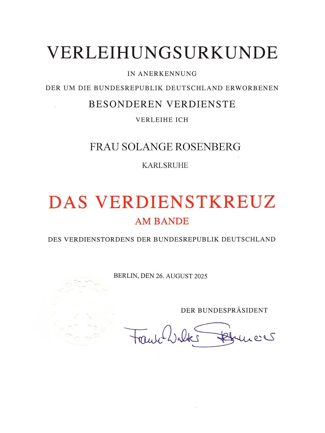 Ein ganz besonderes Chanukka-Geschenk war die erfreuliche Nachricht, dass Frau Solange Rosenberg, die viele Jahre unsere Gemeinde geleitet hat, mit der höchsten Auszeichnung Deutschlands geehrt wurde.
